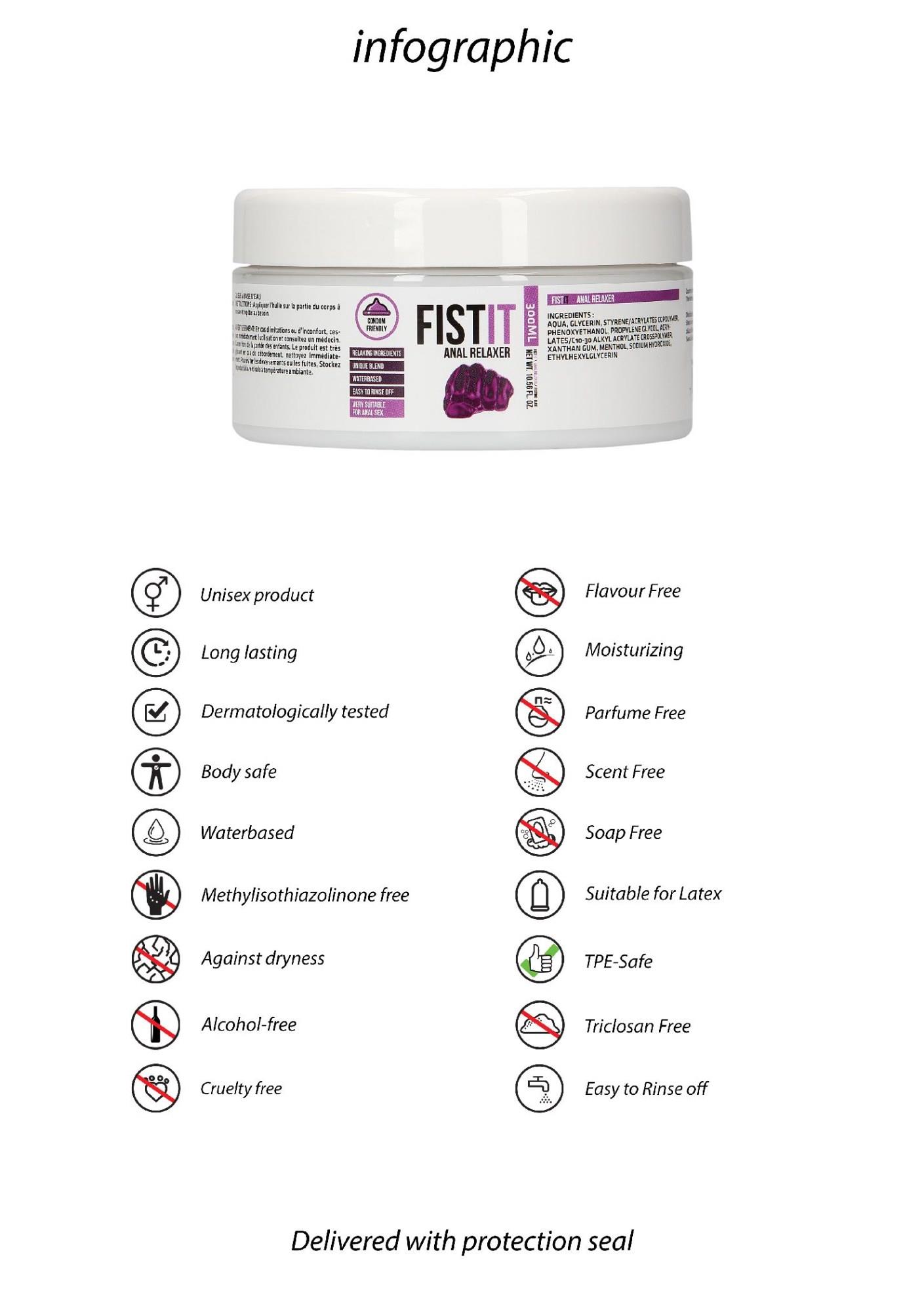 Fist It jest żelem nawilżającym wyprodukowanym na bazie wody. Można go używać jednocześnie z prezerwatywami lateksowymi. Sposób użycia: nałożyć pożądaną ilość żelu na wybrane części ciała i powtarzać tę czynność dowolną ilość razy. Preparat należy przechowywać w chłodnym i ciemnym miejscu, niedostępnym dla dzieci.